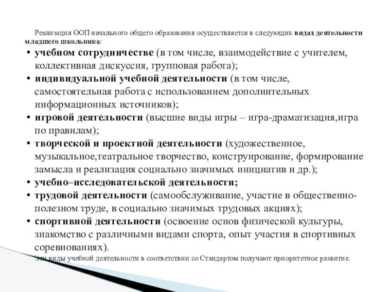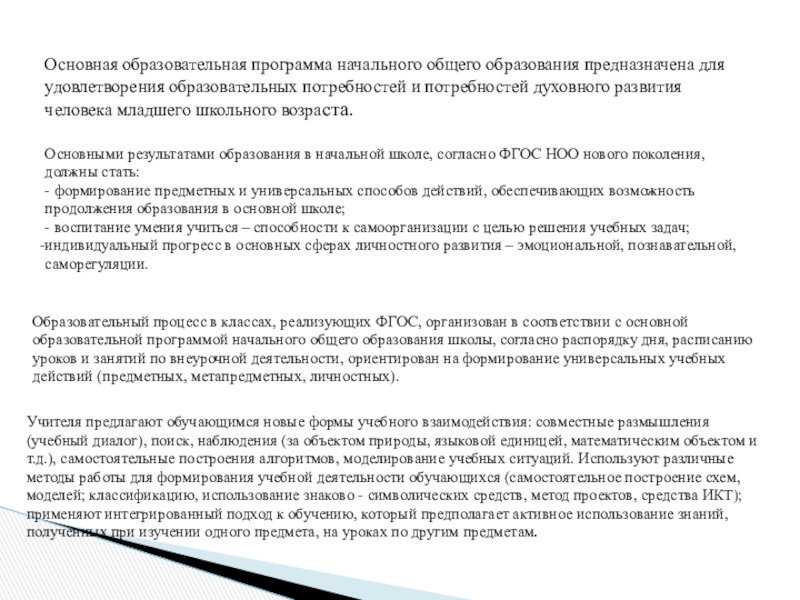 Образовательный процесс в классах, реализующих ФГОС, организован в соответствии с основной образовательной программой начального общего образования школы, согласно распорядку дня, расписанию уроков и занятий по внеурочной деятельности, ориентирован на формирование универсальных учебных действий (предметных, метапредметных, личностных).