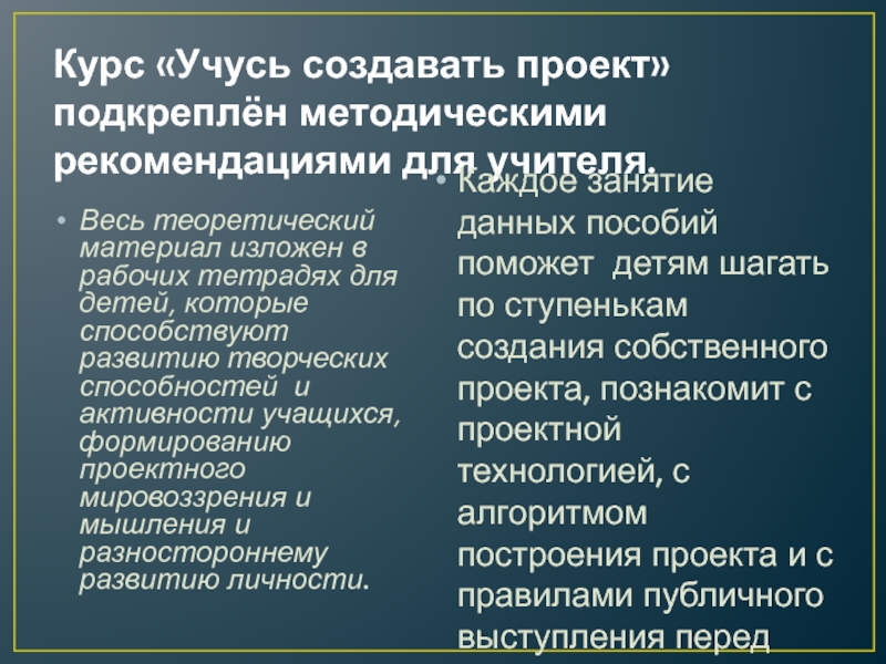 Каждое занятие данных пособий поможет детям шагать по ступенькам создания собственного проекта, познакомит с проектной технологией, с алгоритмом построения проекта и с правилами публичного выступления перед незнакомой аудиторией.