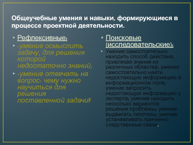 Умение самостоятельно находить способ действия, привлекая знания из различных областей; умение самостоятельно найти недостающую информацию в информационном поле; умение запросить недостающую информацию у эксперта; умение находить несколько вариантов решения проблемы; умение выдвигать гипотезы; умение устанавливать причинно-следственные связи.