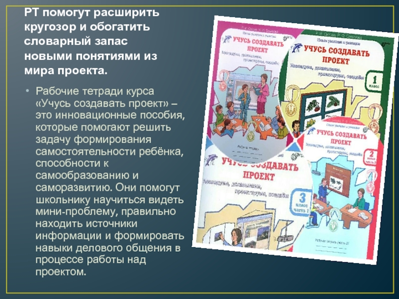 Рабочие тетради курса «Учусь создавать проект» – это инновационные пособия, которые помогают решить задачу формирования самостоятельности ребёнка, способности к самообразованию и саморазвитию. Они помогут школьнику научиться видеть мини-проблему, правильно находить источники информации и формировать навыки делового общения в процессе работы над проектом.