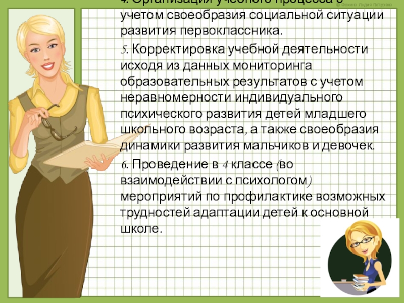 4. Организация учебного процесса с учетом своеобразия социальной ситуации развития первоклассника.5. Корректировка учебной деятельности исходя из данных