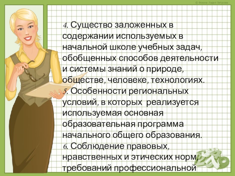 обобщенных способов деятельности и системы знаний о природе, обществе, человеке, технологиях. 5. Особенности региональных условий, в которых реализуется используемая основная образовательная программа начального общего образования. 6. Соблюдение правовых, нравственных и этических норм, требований профессиональной этики.