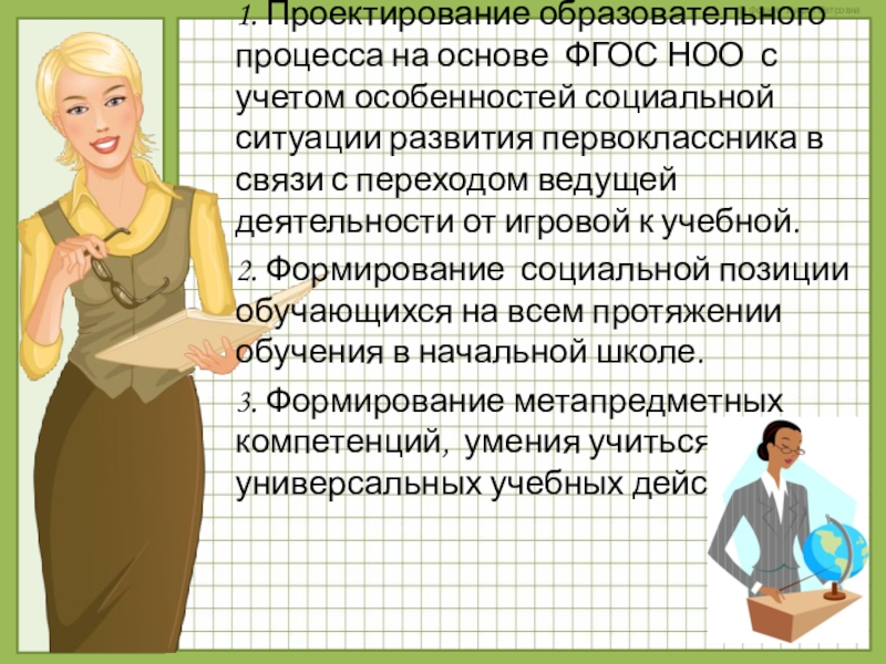 1. Проектирование образовательного процесса на основе ФГОС НОО с учетом особенностей социальной ситуации развития первоклассника в связи с переходом ведущей деятельности от игровой к учебной.2. Формирование социальной позиции обучающихся на всем протяжении обучения в начальной школе.3.