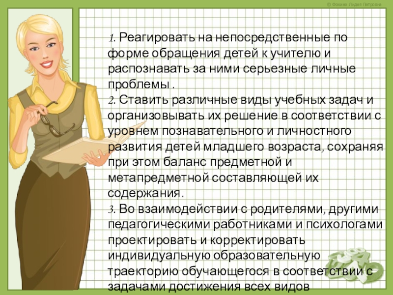 1. Реагировать на непосредственные по форме обращения детей к учителю и распознавать за ними серьезные личные