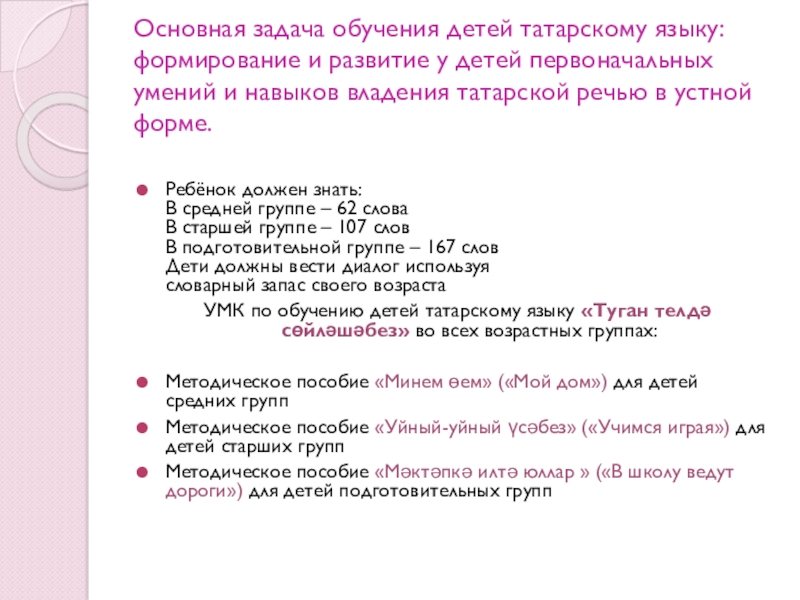 УМК по обучению детей татарскому языку «Туган телдә сөйләшәбез» во всех возрастных группах: