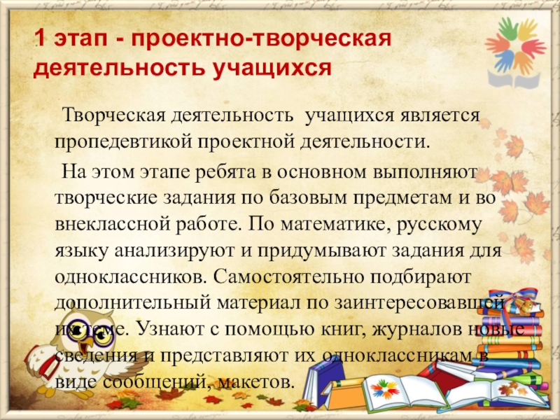 Слайд 71 этап - проектно-творческая деятельность учащихся