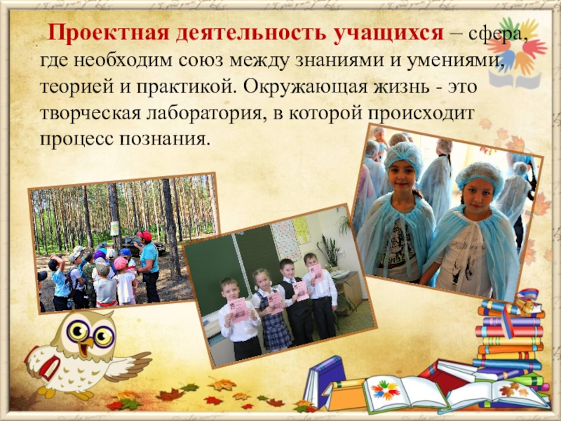Слайд 3 Проектная деятельность учащихся – сфера, где необходим союз между знаниями и