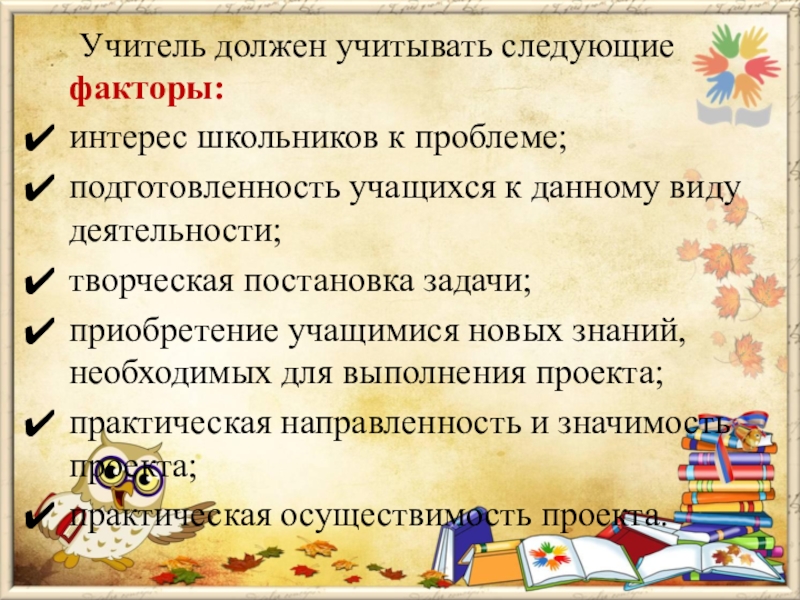 Слайд 6 Учитель должен учитывать следующие факторы: