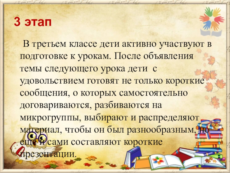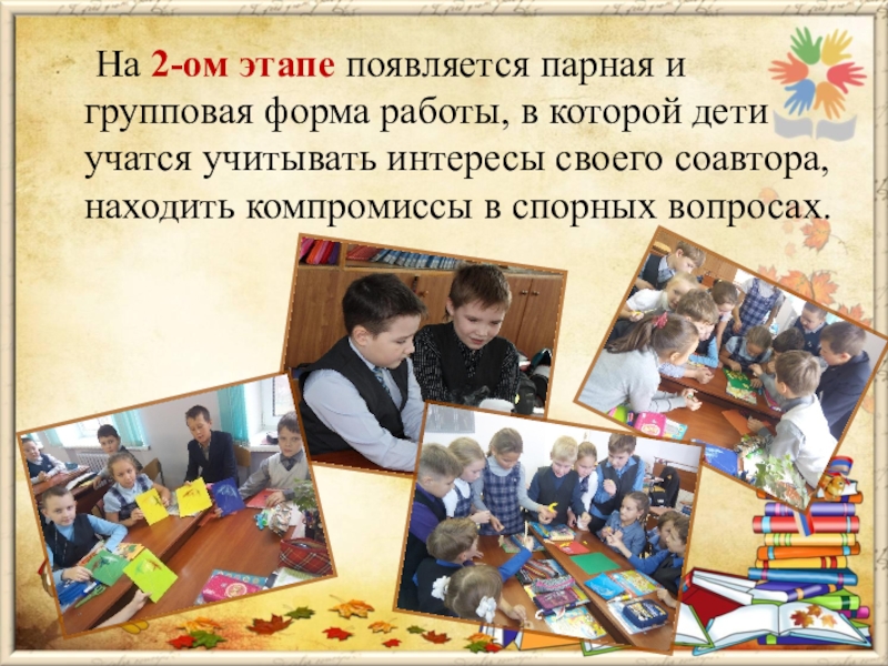На этом этапе ребята в основном выполняют творческие задания по базовым предметам и во внеклассной работе. По математике, русскому языку анализируют и придумывают задания для одноклассников. Самостоятельно подбирают дополнительный материал по заинтересовавшей их теме. Узнают с помощью книг, журналов новые сведения и представляют их одноклассникам в виде сообщений, макетов.