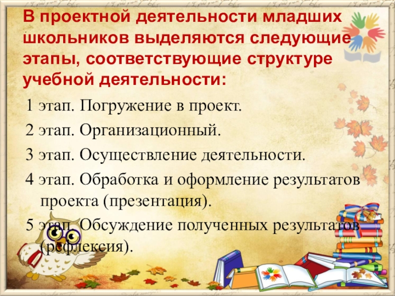 Слайд 5В проектной деятельности младших школьников выделяются следующие этапы, соответствующие структуре учебной