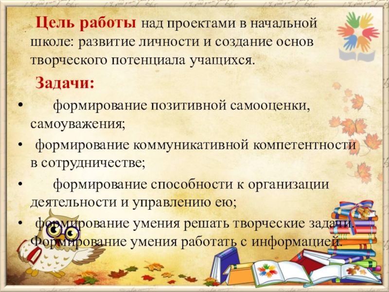 Слайд 4 Цель работы над проектами в начальной школе: развитие личности и создание