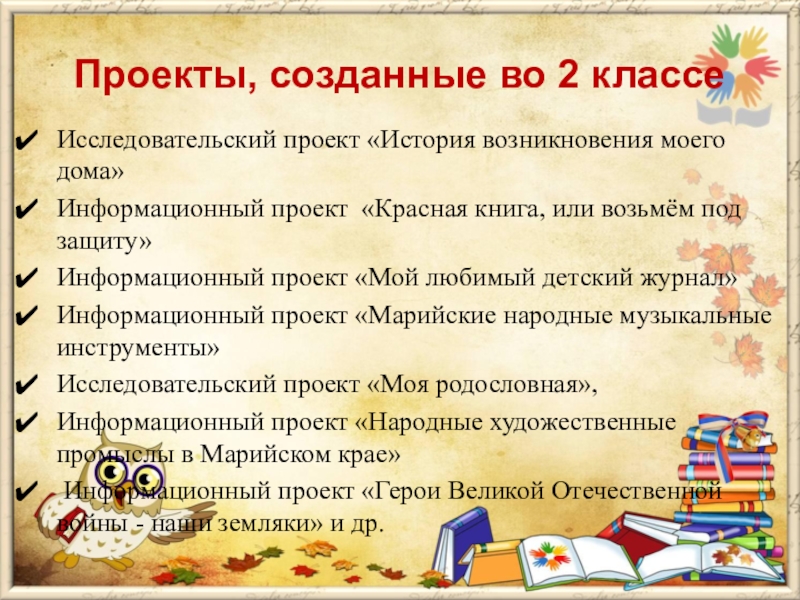 небольшие творческие, исследовательские задания по литературному чтению, окружающему миру. Погружение в проект происходит во время учебного процесса, а практическое выполнение – дома при участии родителей.