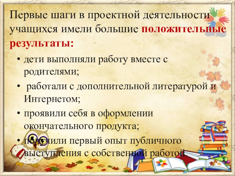 Слайд 15Первые шаги в проектной деятельности учащихся имели большие положительные результаты: