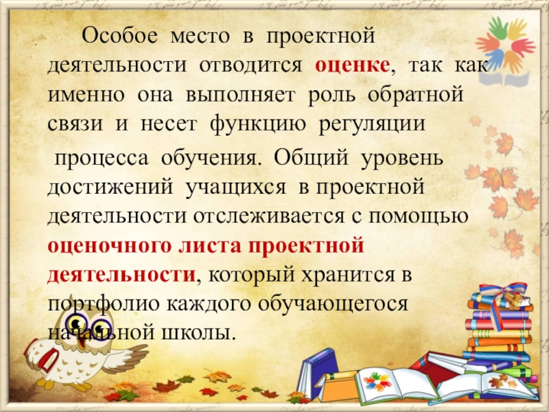 Слайд 19 Особое место в проектной деятельности отводится оценке, так как именно она