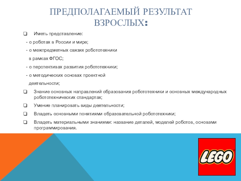 Владеть материальными знаниями: название деталей, моделей роботов, основами программирования.