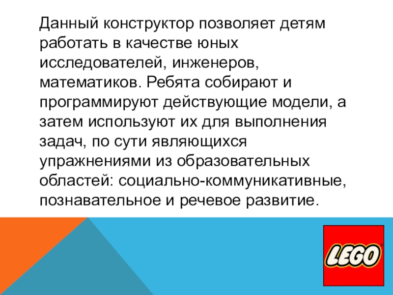 Слайд 8Данный конструктор позволяет детям работать в качестве юных исследователей, инженеров, математиков.