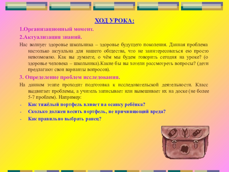 образовательная: проанализировать данные в медицинской литературе по теме исследования; описать, как влияют тяжёлые портфели и ранцы на растущий организм ребёнка и к каким последствиям это приводит; доказать, что тяжёлый школьный портфель вредит здоровью ученика; предложить свои способы решения данной проблемы.