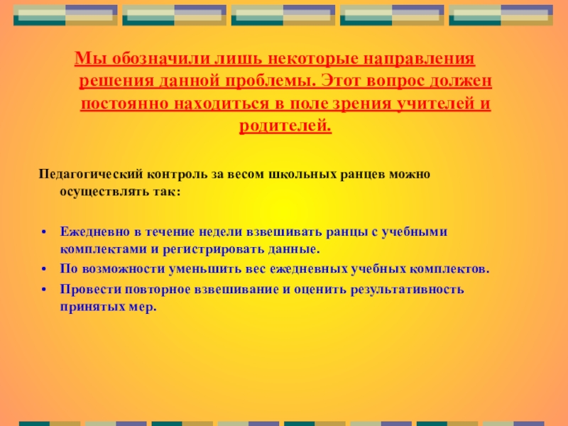 Педагогический контроль за весом школьных ранцев можно осуществлять так: