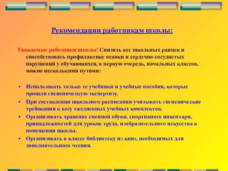 Уважаемые работники школы! Снизить вес школьных ранцев и способствовать