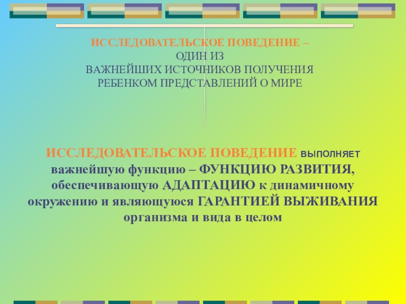 ИССЛЕДОВАТЕЛЬСКОЕ ПОВЕДЕНИЕ ВЫПОЛНЯЕТ важнейшую функцию – ФУНКЦИЮ РАЗВИТИЯ, обеспечивающую АДАПТАЦИЮ к динамичному окружению и являющуюся ГАРАНТИЕЙ ВЫЖИВАНИЯ организма и вида в целом