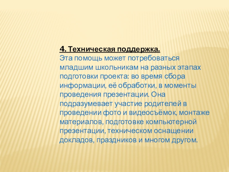 подготовки проекта: во время сбора информации, её обработки, в моменты проведения презентации. Она подразумевает участие родителей в проведении фото и видеосъёмок, монтаже материалов, подготовке компьютерной презентации, техническом оснащении докладов, праздников и многом другом.
