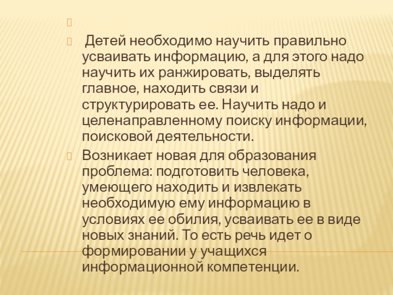 Возникает новая для образования проблема: подготовить человека, умеющего находить и извлекать необходимую ему информацию в условиях ее обилия, усваивать ее в виде новых знаний. То есть речь идет о формировании у учащихся информационной компетенции.