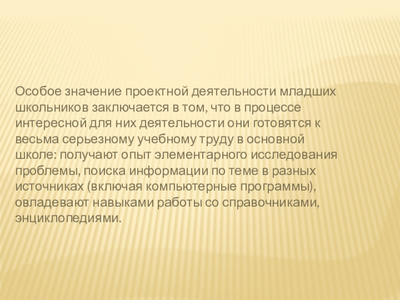 Слайд 7Особое значение проектной деятельности младших школьников заключается в том, что в