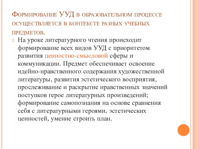 уроке литературного чтения происходит формирование всех видов УУД с приоритетом развития ценностно-смысловой сферы и коммуникации. Предмет обеспечивает освоение идейно-нравственного содержания художественной литературы, развития эстетического восприятия, прослеживание и раскрытие нравственных значений поступков герое литературных произведений; формирование самопознания на основе сравнения себя с литературными героями, эстетических ценностей, умение строить план.