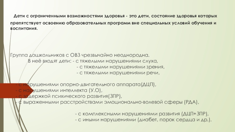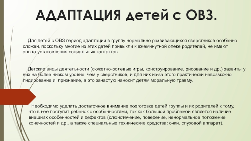 в группу нормально развивающихся сверстников особенно сложен, поскольку многие из этих детей привыкли к ежеминутной опеке родителей, не имеют опыта установления социальных контактов.
