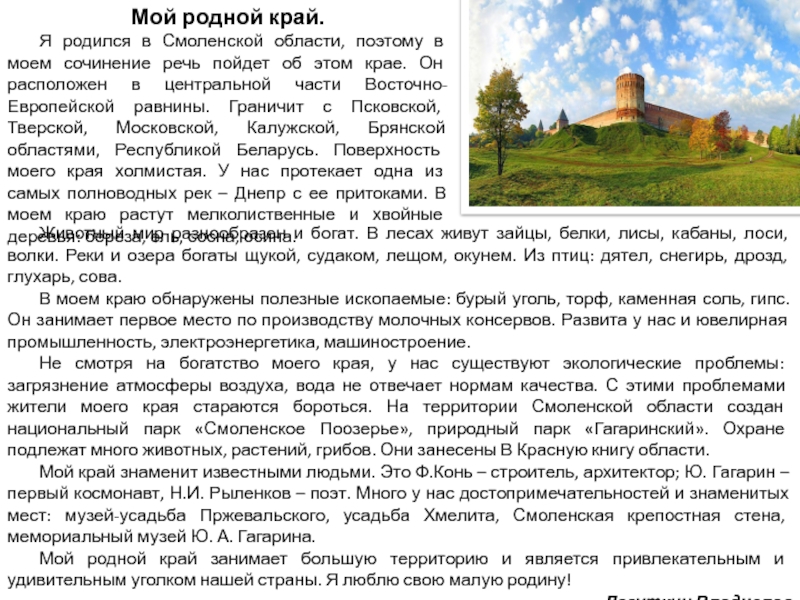 Я родился в Смоленской области, поэтому в моем сочинение речь пойдет об этом крае. Он расположен в центральной части Восточно-Европейской равнины. Граничит с Псковской, Тверской, Московской, Калужской, Брянской областями, Республикой Беларусь. Поверхность моего края холмистая. У нас протекает одна из самых полноводных рек – Днепр с ее притоками. В моем краю растут мелколиственные и хвойные деревья: береза, ель, сосна, осина.