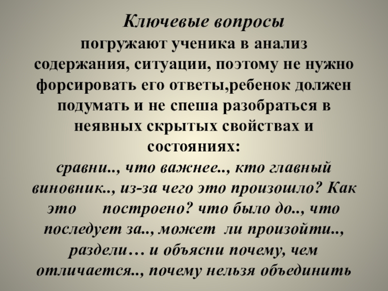 форсировать его ответы,ребенок должен подумать и не спеша разобраться в неявных скрытых свойствах и состояниях: