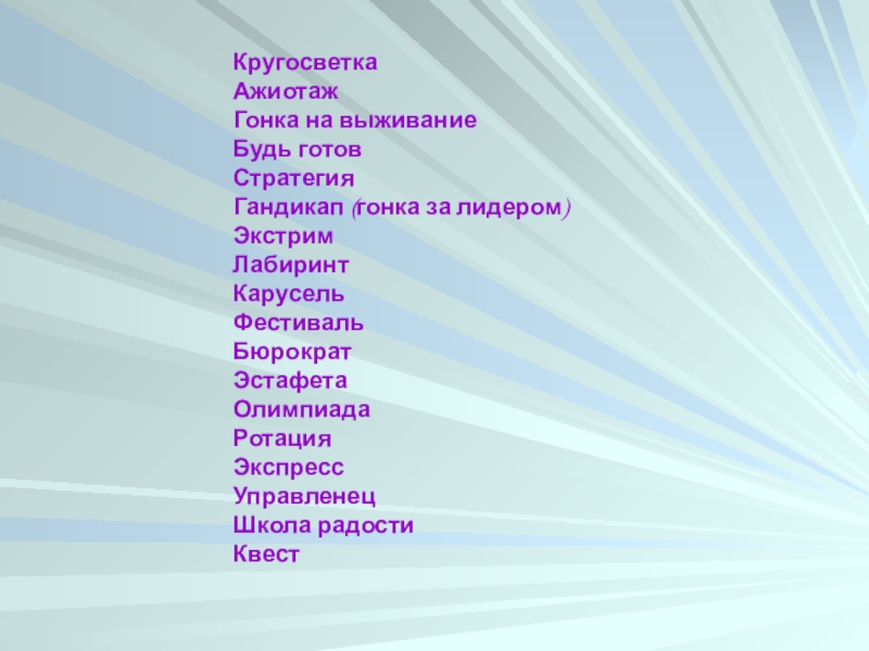 КругосветкаАжиотажГонка на выживаниеБудь готовСтратегияГандикап (гонка за лидером)ЭкстримЛабиринтКарусельФестивальБюрократЭстафетаОлимпиадаРотацияЭкспрессУправленецШкола радостиКвест