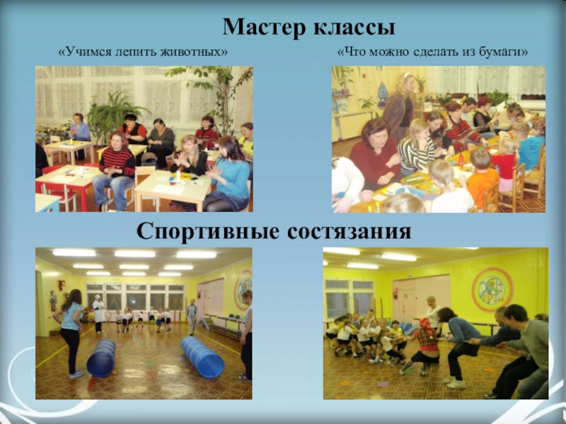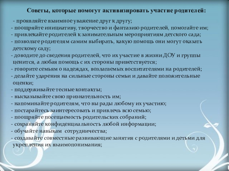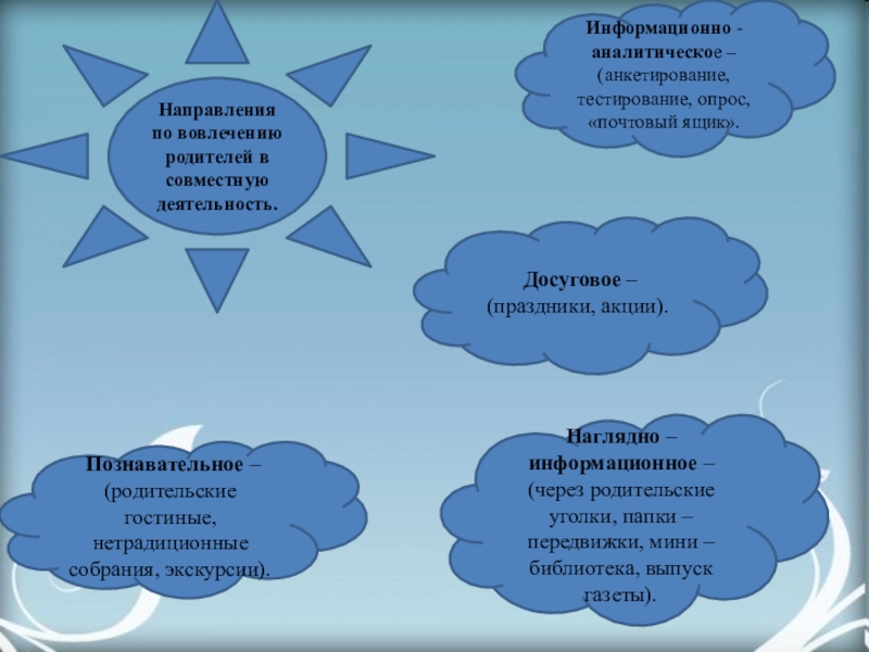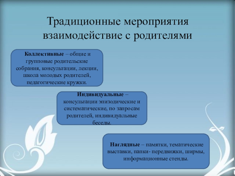 (родительские гостиные, нетрадиционные собрания, экскурсии).