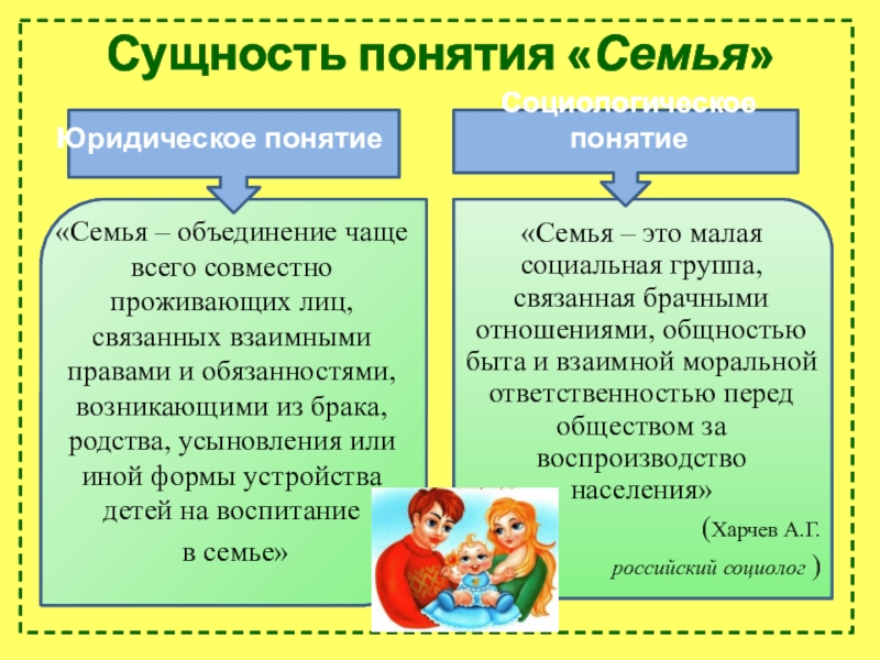 «Семья – это малая социальная группа, связанная брачными отношениями, общностью быта и взаимной моральной ответственностью перед обществом за воспроизводство населения»