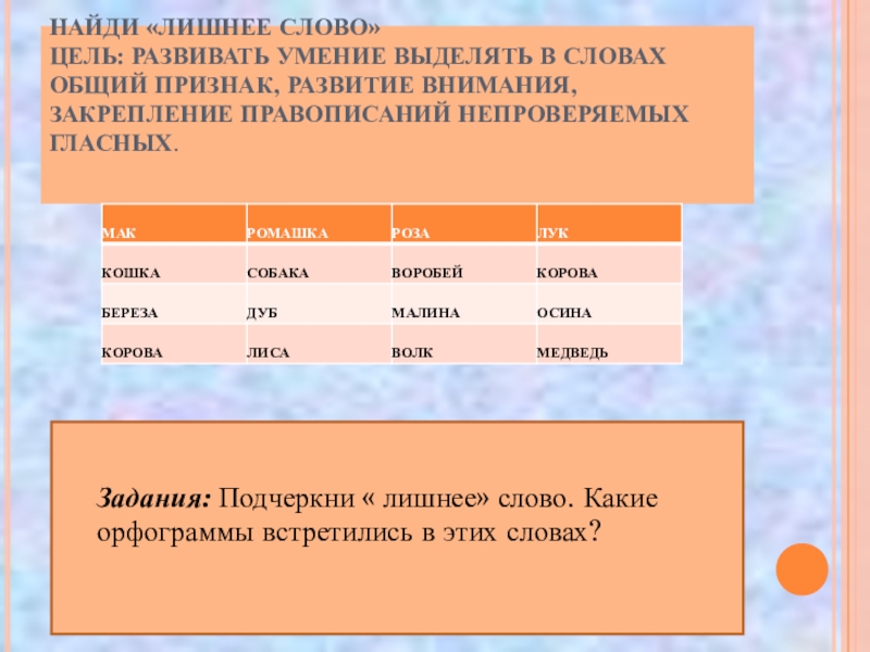 Задания: Подчеркни « лишнее» слово. Какие орфограммы встретились в этих словах?