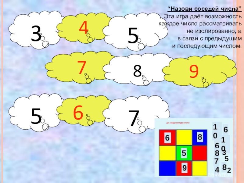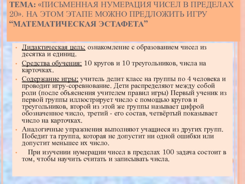 Содержание игры: учитель делит класс на группы по 4 человека и проводит игру-соревнование. Дети распределяют между собой роли (после объяснения учителем правил игры) Первый ученик из первой группы иллюстрирует число с помощью кругов и треугольников, второй из этой же группы называет цифрой обозначенное число, третий - его состав, четвёртый показывает число на карточках.