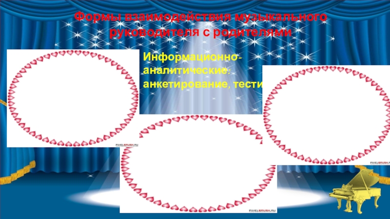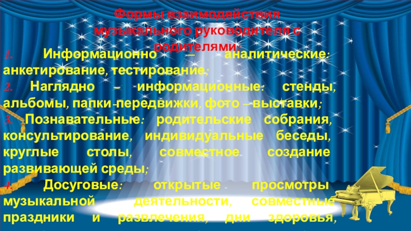 Слайд 10Формы взаимодействия музыкального руководителя с родителями:
