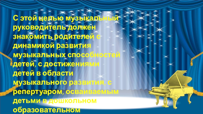 Слайд 9С этой целью музыкальный руководитель должен знакомить родителей с динамикой развития