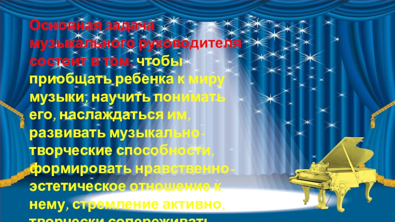 Слайд 3Основная задача музыкального руководителя состоит в том, чтобы приобщать ребенка к