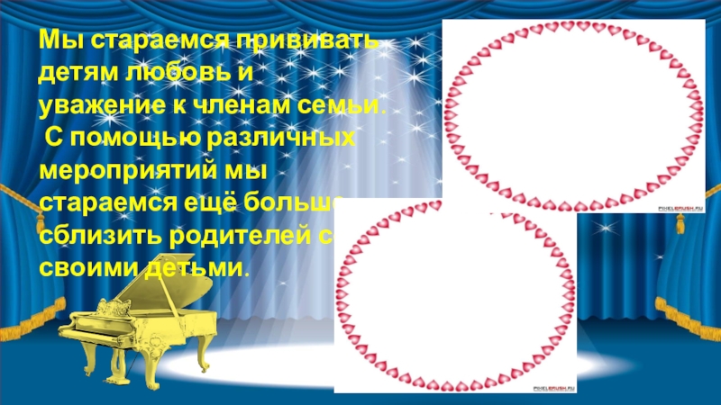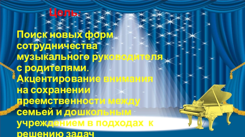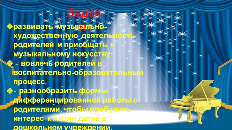 развивать музыкально-художественную деятельность родителей и приобщать к музыкальному искусству.