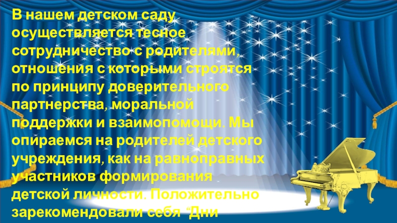 Слайд 11В нашем детском саду осуществляется тесное сотрудничество с родителями, отношения с