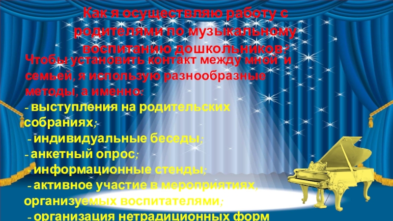 Слайд 12Как я осуществляю работу с родителями по музыкальному воспитанию дошкольников?