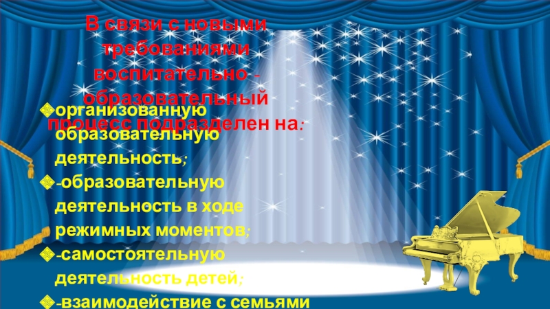 Слайд 7В связи с новыми требованиями воспитательно -образовательный процесс подразделен на:
