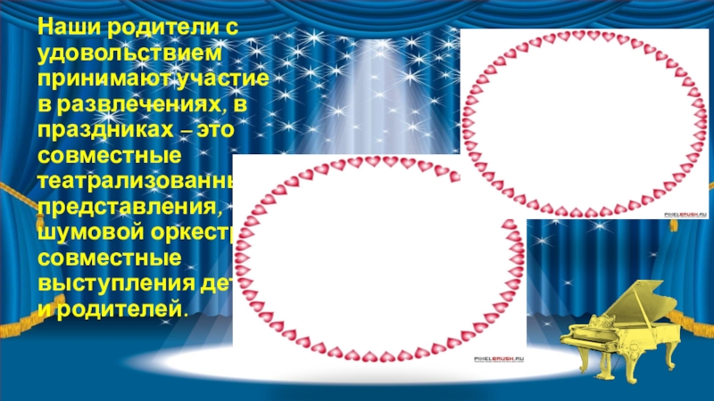 это совместные театрализованные представления, шумовой оркестр, совместные выступления детей и родителей.