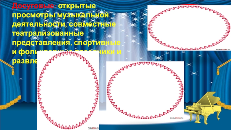Слайд 18Досуговые: открытые просмотры музыкальной деятельности, совместные театрализованные представления, спортивные и фольклорные