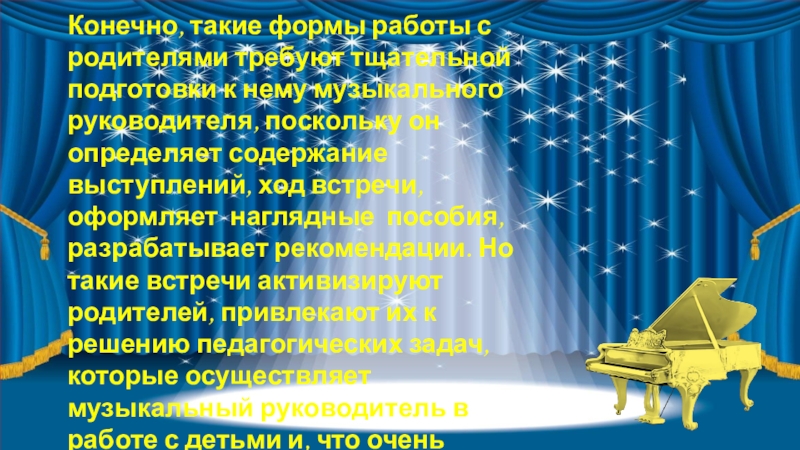 музыкального руководителя, поскольку он определяет содержание выступлений, ход встречи, оформляет наглядные пособия, разрабатывает рекомендации. Но такие встречи активизируют родителей, привлекают их к решению педагогических задач, которые осуществляет музыкальный руководитель в работе с детьми и, что очень важно, повышают личный авторитет педагога.