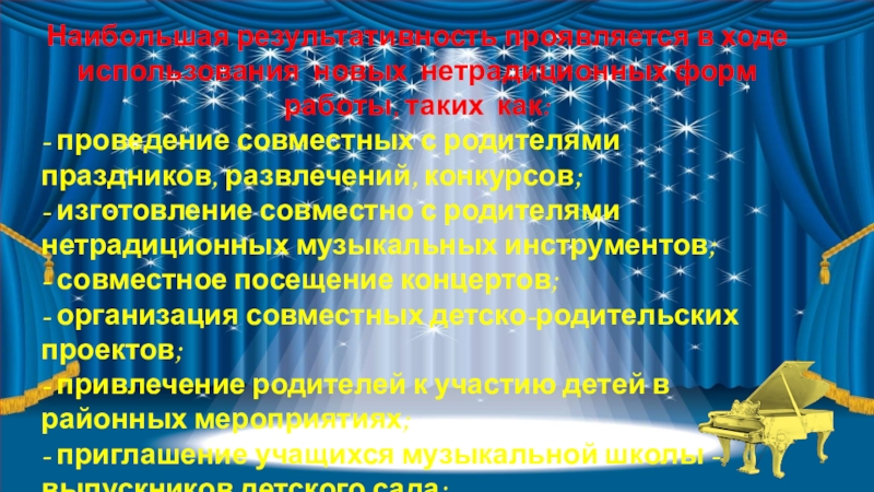Слайд 8 Поиск новых форм сотрудничества музыкального руководителя с родителями