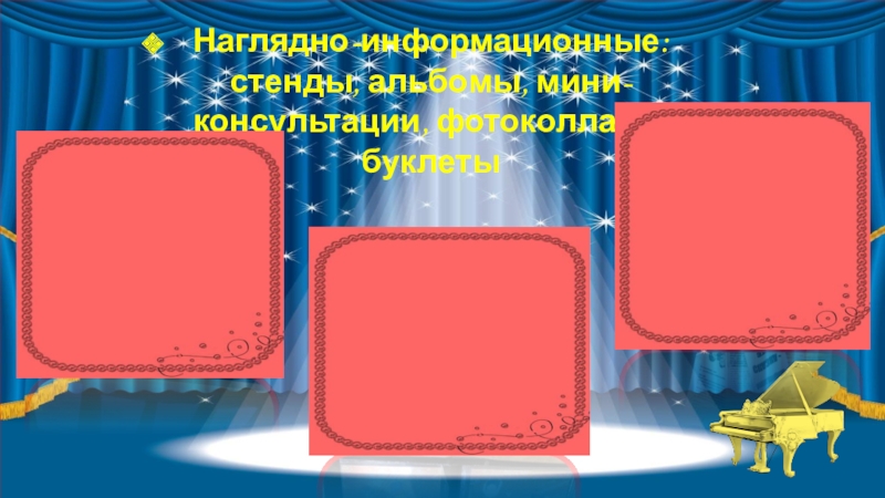 Слайд 17Наглядно-информационные: стенды, альбомы, мини-консультации, фотоколлажи, буклеты