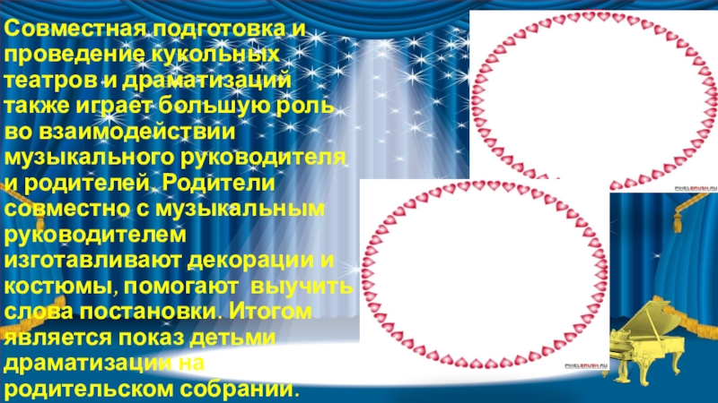 роль во взаимодействии музыкального руководителя и родителей. Родители совместно с музыкальным руководителем изготавливают декорации и костюмы, помогают выучить слова постановки. Итогом является показ детьми драматизации на родительском собрании.