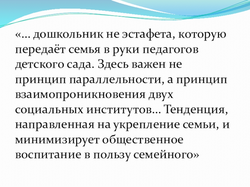 «… дошкольник не эстафета, которую передаёт семья в руки педагогов детского сада. Здесь важен не принцип параллельности, а принцип взаимопроникновения двух социальных институтов… Тенденция, направленная на укрепление семьи, и минимизирует общественное воспитание в пользу семейного»